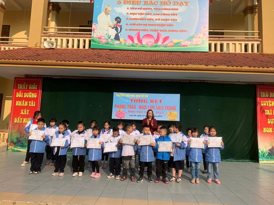 Thực hiện công văn số 01/CVLN- CTĐ-PGD&ĐT- ĐTN ngày 03/01/2023 của Hội chữ thập đỏ, Phòng giáo dục và đào tạo, Đoàn TNCS Hồ Chí Minh quận Kiến An về cuộc vận động “Góp những đồng tiền nhỏ vì nghĩa tình lớn- Tặng quà đầu xuân giúp bạn nghèo và nạn nhân chất độc màu da cam”. Sáng ngày 27 tháng 02 năm 2022, Liên đội Trường Tiểu học Nguyễn Du long trọng tổ chức tổng kết phong trào “Góp những đồng tiền nhỏ vì nghĩa tình lớn” qua hình thức Nuôi lợn siêu trọng.