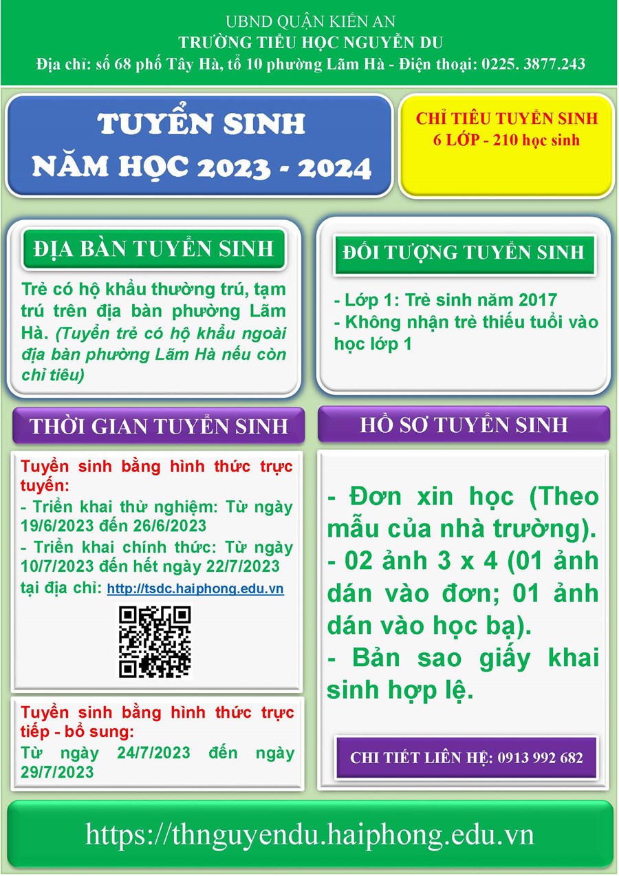 Căn cứ vào kết quả điều tra số trẻ sinh năm 2017 trên địa bàn phường Lãm Hà; căn cứ tình hình thực tế của nhà trường, Trường Tiểu học Nguyễn Du Thông báo tuyển sinh năm học 2023-2024 như sau: